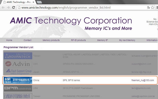 The original site: http://www.amictechnology.com/english/programmer_vendor_list.html