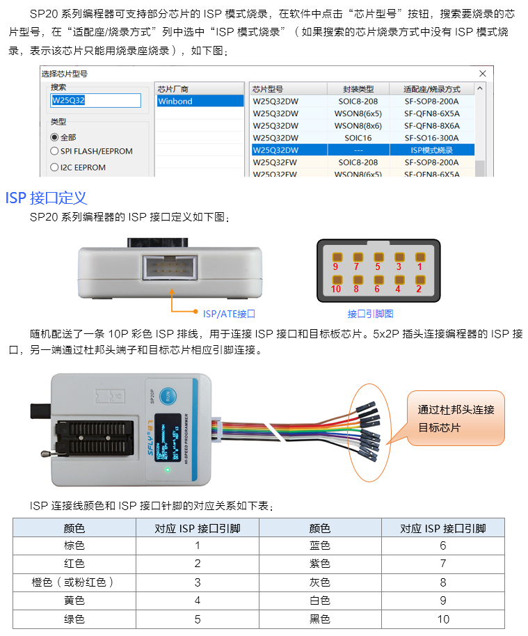 ISP全称为In System Program,ISP烧录模式仅需要连接几条信号线到板载芯片的相关引脚,即可实现芯片的读写操作,可免除拆焊芯片的麻烦。SP20具有一个10P ISP/ATE复用接口,可以通过此接口对芯片进行ISP在线烧录。