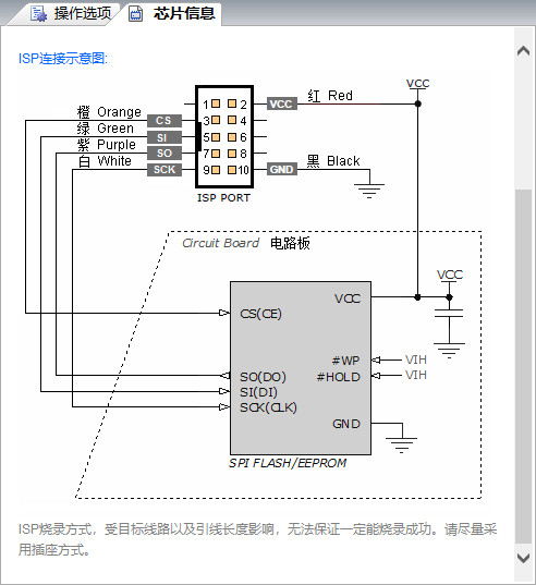 在软件中选择当前芯片的ISP方式烧录,在软件“芯片信息”页可以看到连接原理图,25系列SPI FLASH连接原理图如下: