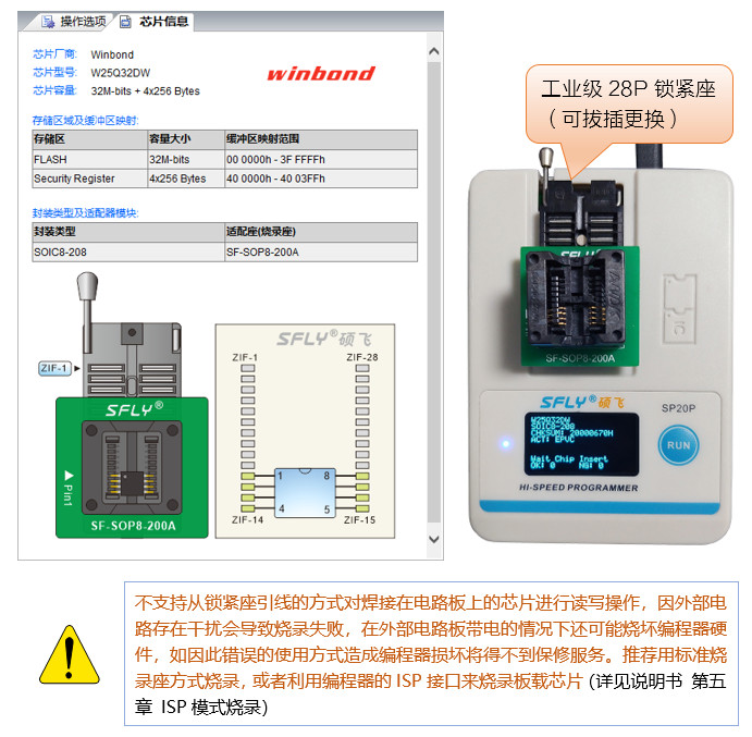 使用工业级28P锁紧座子,可以拔插更换。支持通用的芯片转接座(烧录器),通过软件界面可以查看芯片和烧录座在编程器上的插放方式。