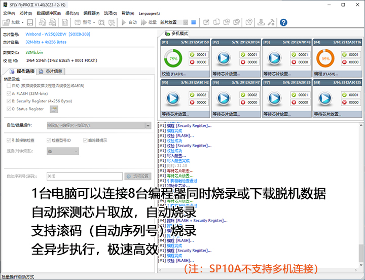在烧录座上依次放入被烧录的芯片,编程器检测到芯片放入后自动启动烧录。每台编程器各自独立工作,全异步模式烧录,不需要同步等待,软件烧录界面如下;