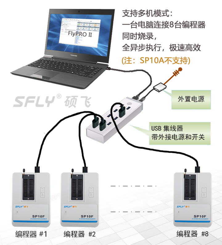 编程器软件支持在一台电脑上连接最多8台SP10B/SP10F编程器同时烧录(注:SP10A不支持多机连接),支持8台SP10F编程器同时下载脱机数据。使用USB HUB(USB集线器))将多台编程器连接到电脑USB口(USB集线器必须带外置电源适配器,并需要使用外置电源供电)。注意多机模式下只支持同型号编程器一起使用,不同型号不能混用。