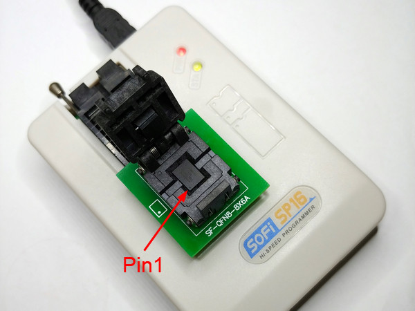 SF-QFN8-8X6A,SF-QFN8-6X5A,SF-QFN8-4X4A,SF-QFN8-3X2A 烧录座均以底边排针对齐锁紧座底边插入,芯片1脚方向请参考图示说明