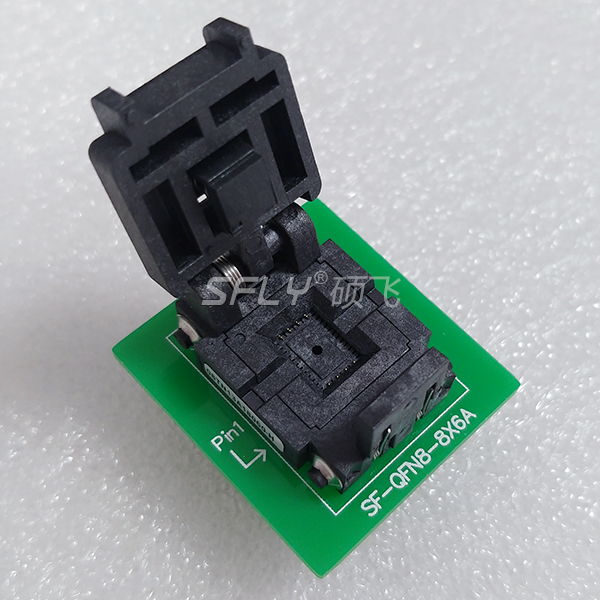 SF-QFN8-8X6A,SF-QFN8-6X5A,SF-QFN8-4X4A,SF-QFN8-3X2A 烧录座均以底边排针对齐锁紧座底边插入,芯片1脚方向请参考图示说明