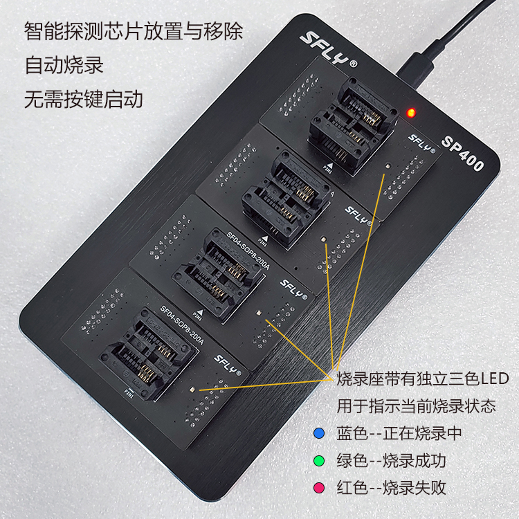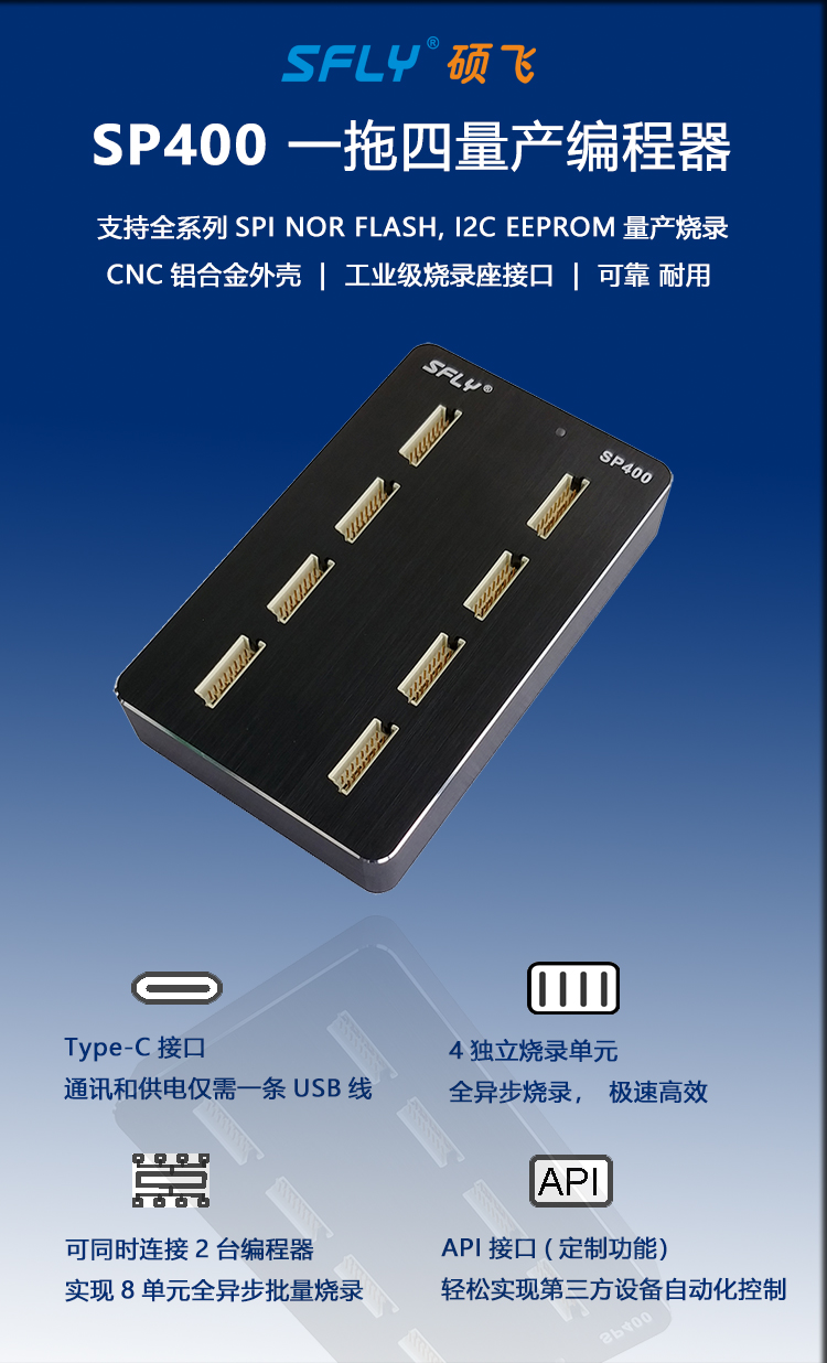 SP400是深圳硕飞科技推出的一款SPI FLASH专用量产型编程器,全面支持国内外各厂商的SPI NOR FLASH、I2C EEPROM等高速量产烧录。使用USB口通讯,无需外接电源。相比昂贵的通用型编程器,SP400具有使用简单,经济高效的特点。
