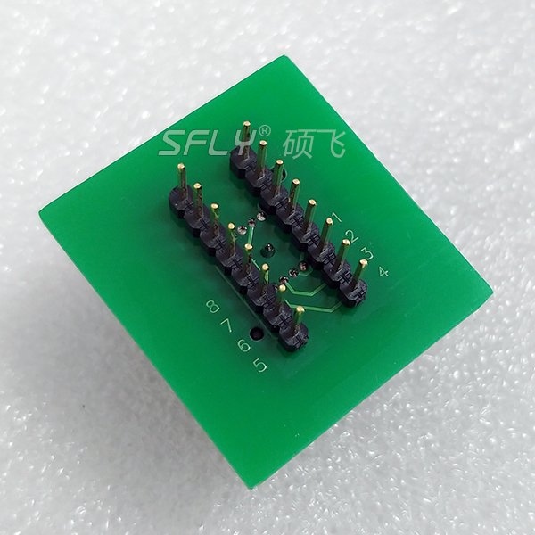 特点: WSON8、USON8、QFN8转DIP,底板引出为双列直插8x2P镀金排针(其中针脚标号1-8对应芯片1-8脚,没有标号的8个针脚为空脚),引脚间距2.54mm(100mil),宽度7.62mm(300mil)