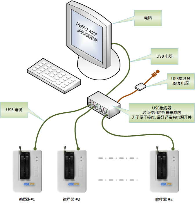 步骤2:使用USB集线器将多台SP16编程器连接到计算机